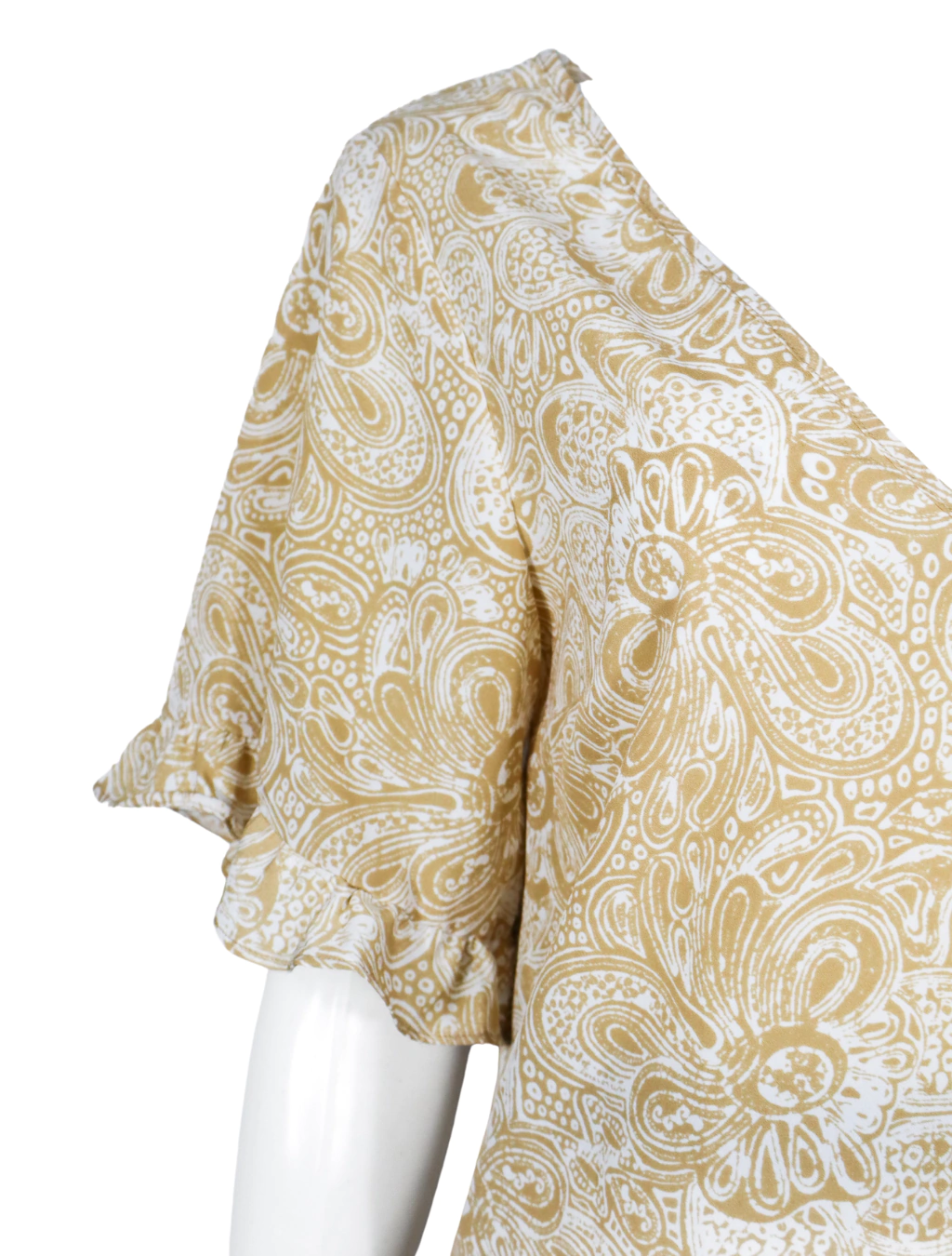 Estampa clássica e fluidez casual se encontram nesta peça leve e versátil. A padronagem paisley em tom cáqui traz sofisticação sutil, enquanto os babados nas mangas adicionam feminilidade ao visual.