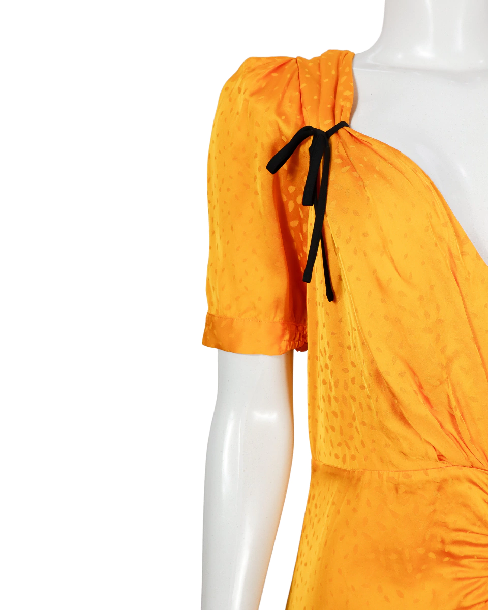 Vestido da Self-Portrait combina o tom vibrante de amarelo com nuances de laranja queimado e design cuidadosamente elaborado, com destaque para os drapeados no busto e abaixo da cintura, que realçam a silhueta com sofisticação. O decote em V frontal e traseiro, aliado às mangas curtas com elástico, criam uma composição moderna e feminina. A fenda lateral e as tiras de amarração nas costas finalizam a peça com charme e sensualidade na medida certa.